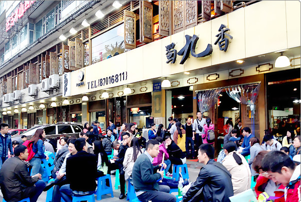 要问蜀九香的人气有多高?看看店门口等位的人群就知道了。偌大的店堂里满当当的都是饕客,却仍然阻挡店外人们等位的热情。
