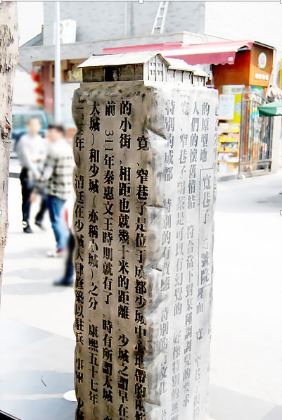 在从窄巷子通往井巷子的路上,沿途都有这样的石柱、模型,以及文字,来介绍宽窄巷子以及个中院落的前世今生。曾经的那些繁华烟云,如今都已化为青砖古巷。