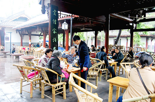 而这露天的茶座,在池水边也有一座长廊,还有那一张张的大理石桌子与竹靠椅,似乎都成了四川茶馆或茶社的标配。