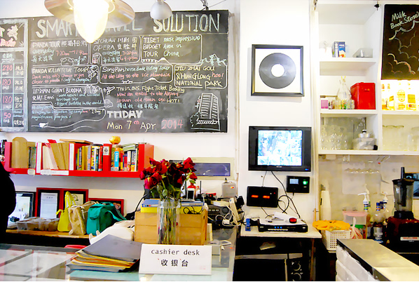 前台对面是一个小房间,四面的书架上摆了各色供来卖的新书,以及一些旅游纪念品。这也是牛奶书铺的名字由来吧。