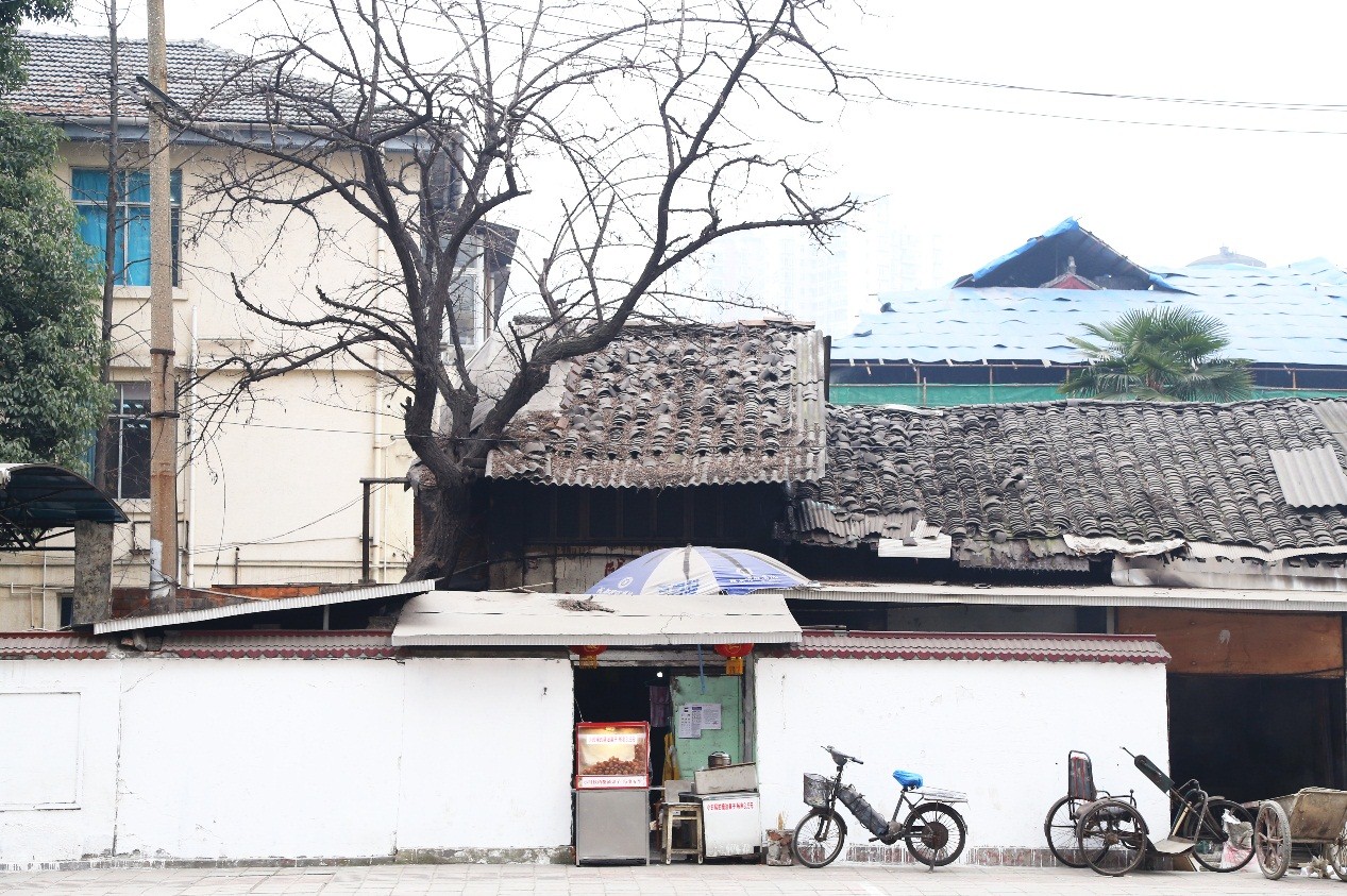 一块白色的沾满油污的铁板上随意潦草地写了几个大红字——“成都小时候的糖油果子”,就算是店名。院里有一棵六十多年的老槐树,夏天一到是绝佳的风景。